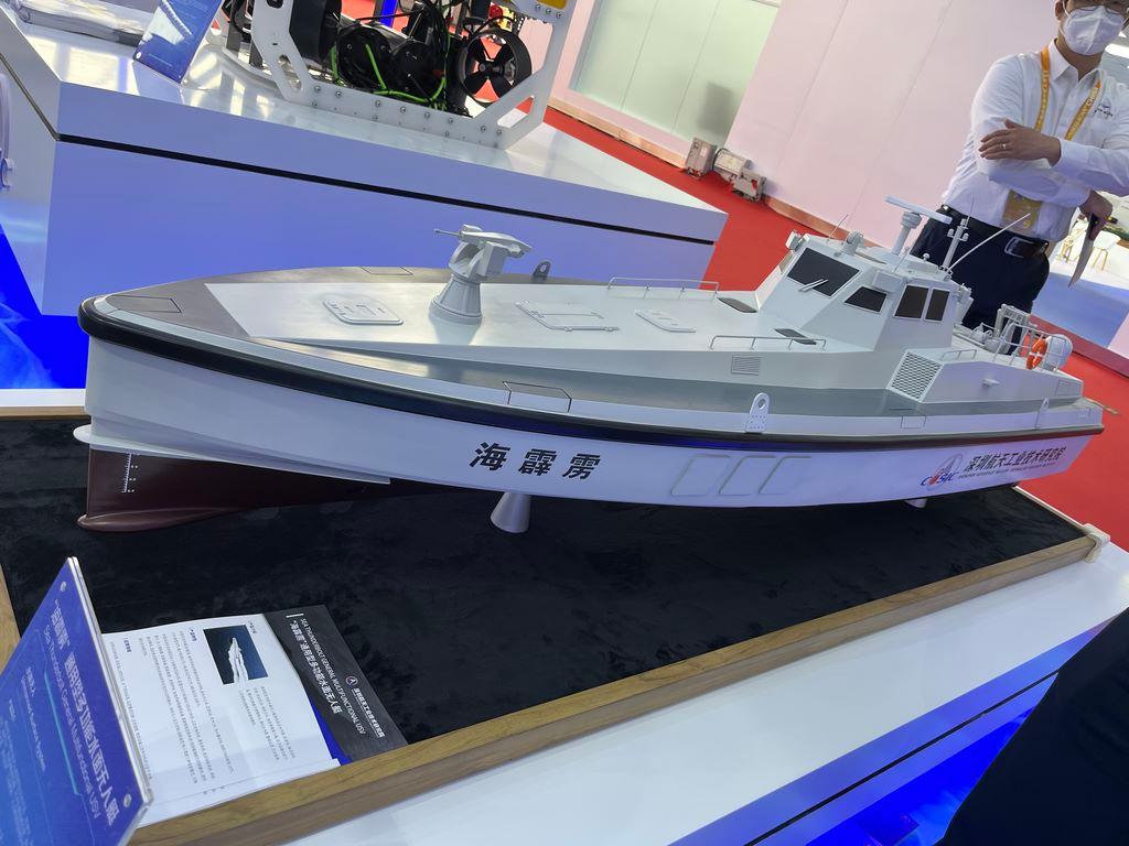 展示装裱:制作木质底座,底部铺黑色绒布,既防滑又提升展示质感;模型放置后,调整角度确保正面视角完整,最后在底座旁放置说明牌,标注“海霹雳海面无人艇”等信息,让模型更具展示性。